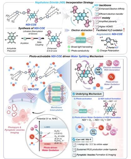 빛에 의해 활성화된 NDI-COE가 암세포막–물 계면에서 물 산화를 촉진해 활성산소종을 생성하고, 파이롭토시스 및 소낭 방출 과정을 시각화하는 개념도.