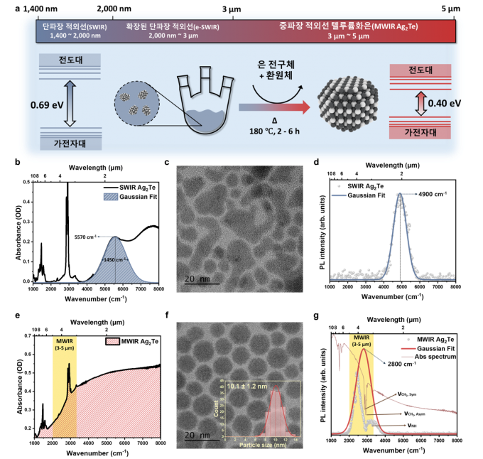 연구팀은 '후성장 공정'이라는 새로운 방법을 고안했다. 먼저 130도의 낮은 온도에서 작은 텔루륨화은 알갱이를 씨앗처럼 만든 뒤 180도로 온도를 높이면서 재료를 더 넣어 알갱이를 키우는 방식이다. 반응 시간을 2~6시간 사이로 조절하는 것만으로 입자 크기를 정밀하게 바꿀 수 있어 감지 파장을 원하는 대로 설정할 수 있다. 기존 합성법으로는 6nm가 한계였던 입자 크기를 10.1nm까지 키우는 데 성공했다.
